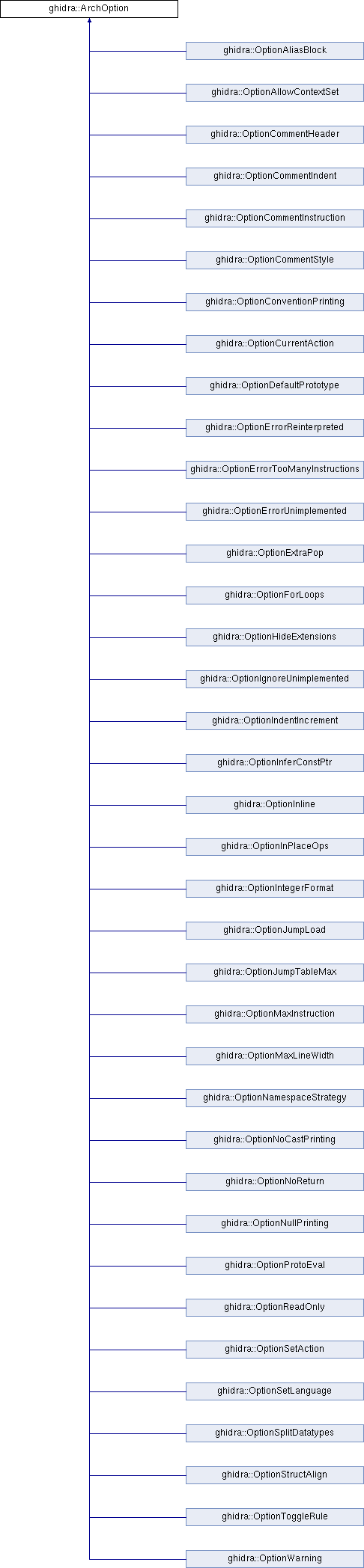 Implemented in ghidra::OptionSplitDatatypes, ghidra::OptionNamespaceStrategy, ghidra::OptionMaxInstruction, ghidra::OptionAliasBlock, ghidra::OptionToggleRule, ghidra::OptionJumpLoad, ghidra::OptionJumpTableMax, ghidra::OptionSetLanguage, ghidra::OptionProtoEval, ghidra::OptionErrorTooManyInstructions, ghidra::OptionErrorReinterpreted, ghidra::OptionErrorUnimplemented, ghidra::OptionIgnoreUnimplemented, ghidra::OptionAllowContextSet, ghidra::OptionCurrentAction, ghidra::OptionSetAction, ghidra::OptionIntegerFormat, ghidra::OptionCommentInstruction, ghidra::OptionCommentHeader, ghidra::OptionCommentStyle, ghidra::OptionCommentIndent, ghidra::OptionIndentIncrement, ghidra::OptionMaxLineWidth, ghidra::OptionHideExtensions, ghidra::OptionNoCastPrinting, ghidra::OptionConventionPrinting, ghidra::OptionInPlaceOps, ghidra::OptionNullPrinting, ghidra::OptionWarning, ghidra::OptionStructAlign, ghidra::OptionNoReturn, ghidra::OptionInline, ghidra::OptionForLoops, ghidra::OptionInferConstPtr, ghidra::OptionDefaultPrototype, ghidra::OptionReadOnly, and ghidra::OptionExtraPop.